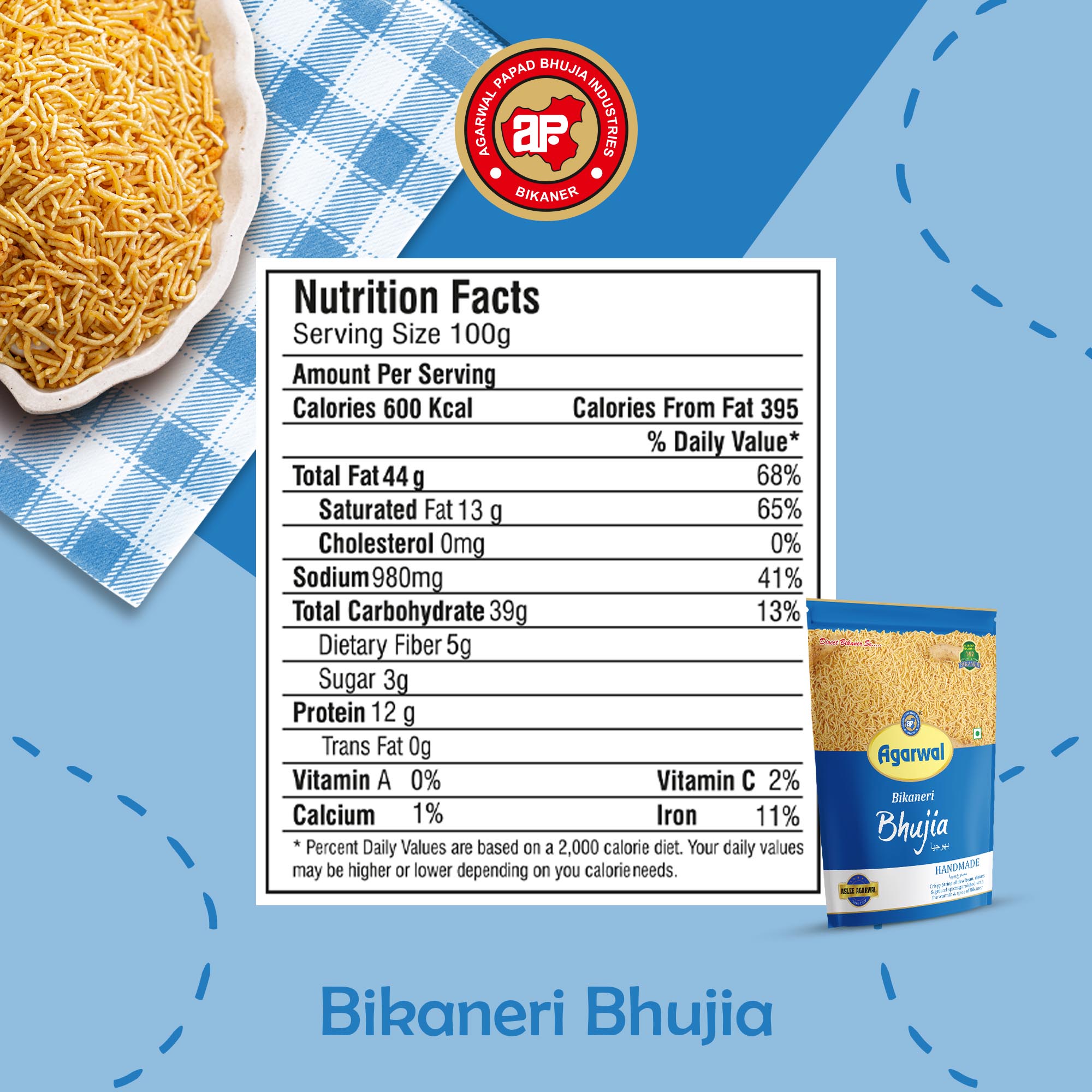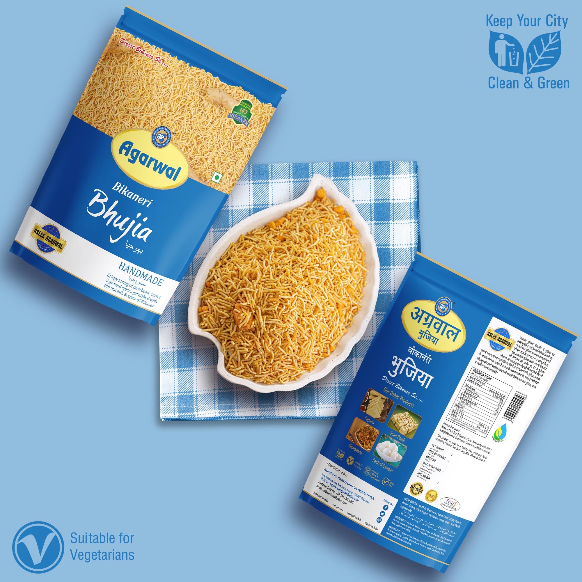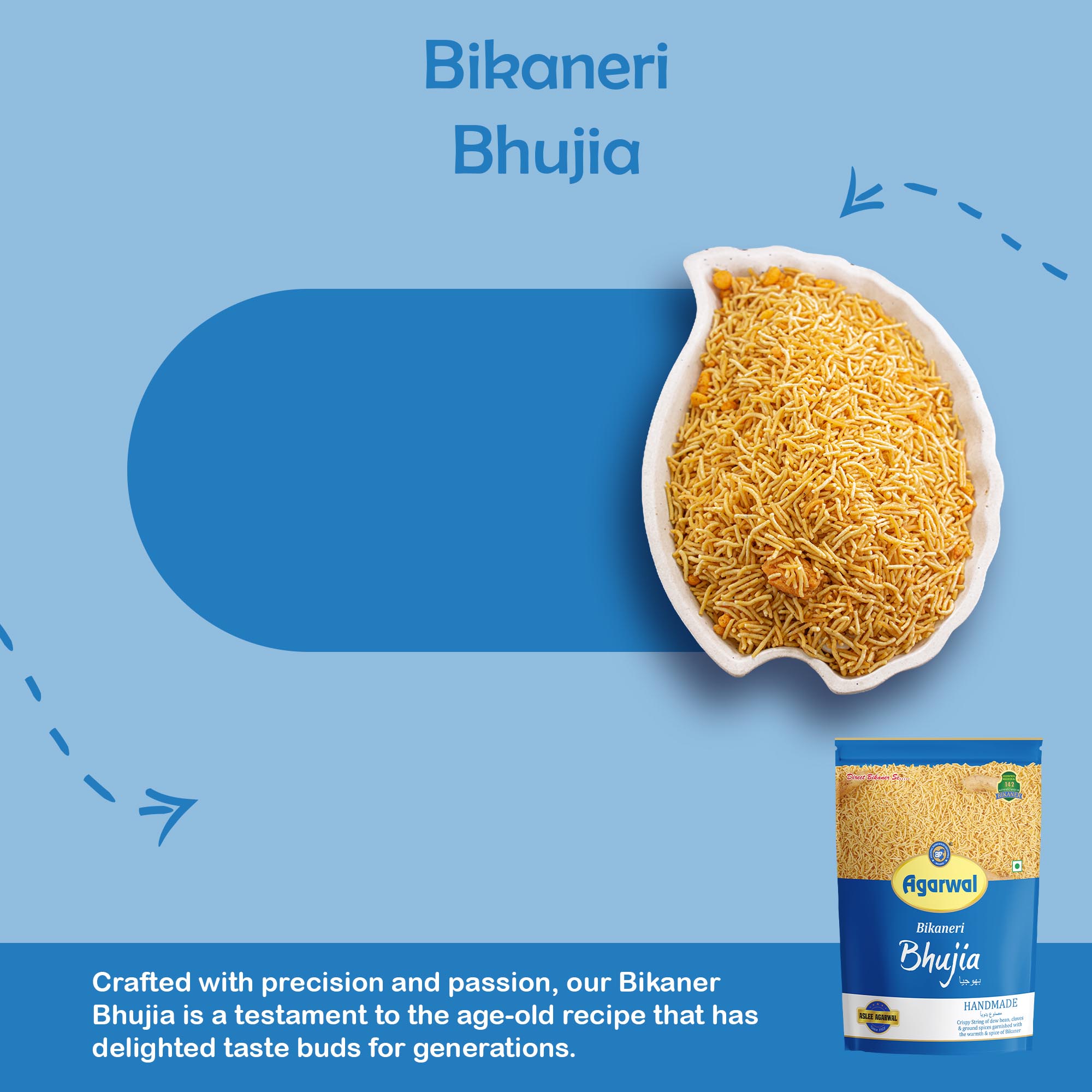 Discover the irresistible flavors of Bikaneri Sonal Bhujia by Agarwal Papad Bhujia Industries. Made with spicy moth & gram flour and a blend of authentic Indian spices, this ready-to-eat snack is a vegetarian delight. Indulge in the renowned taste of Bikaner’s famous food products with each crispy bite of this Bikaneri Bhujia. With no preservatives, it’s a guilt-free snack option that can be enjoyed any time of the day. Whether you’re looking for a spicy and flavorful Indian snack or a tea-time treat, Bikaneri Sonal Bhujia is the perfect choice. Experience the essence of Bikaner’s culinary heritage in this 100% vegetarian, spicy snack sensation.